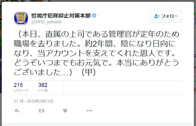 ツイッター警部 が帰ってきた 警視庁アカウント 甲さん にネット大歓迎 他県警も軒並み反応 J Cast ニュース 全文表示